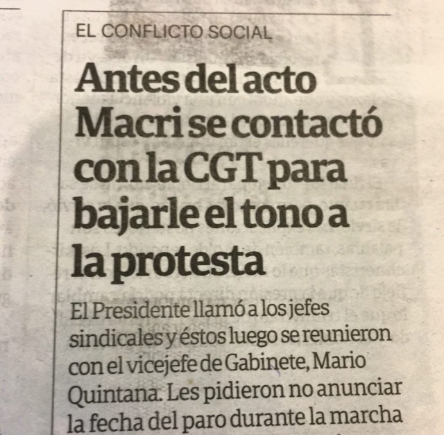 Jueves, 9 de marzo.- Antes del acto, la CGT arregló con Macri no poner fecha de paro. Está todo dicho