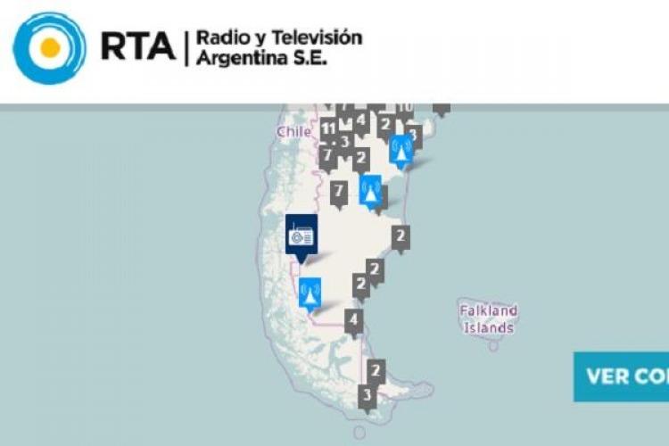 Se trata de un mapa que invita a ver la cobertura de RTA en todo el territorio nacional. Allí, sobre las islas del Atlántico Sur, se lee su denominación en inglés. RTA es una sociedad del Estado que administra los medios de comunicación estatales y depende de la Secretaría de Medios Públicos, encabezada por Lombardi.