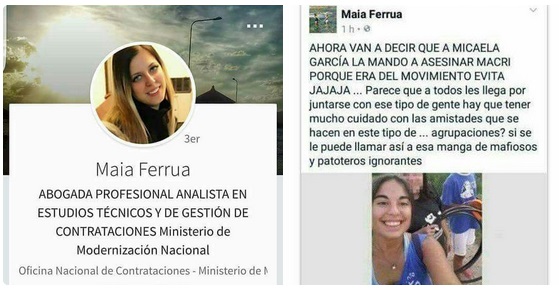 Domingo, 9 de abril.- Nuevamente las redes sociales sirvieron para ver el grado de fanatismo e intolerancia de personas adherentes al Gobierno nacional, en este caso una funcionaria del Ministerio de Modernización.